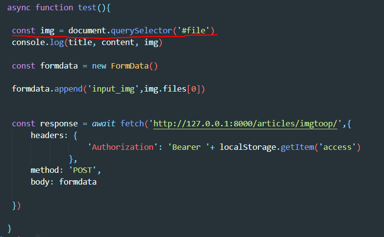 - form data 형식으로 보낼 때 getelementId로 받아오면 파일을 읽지 못해서 queryselector로 변경하여 읽어옴