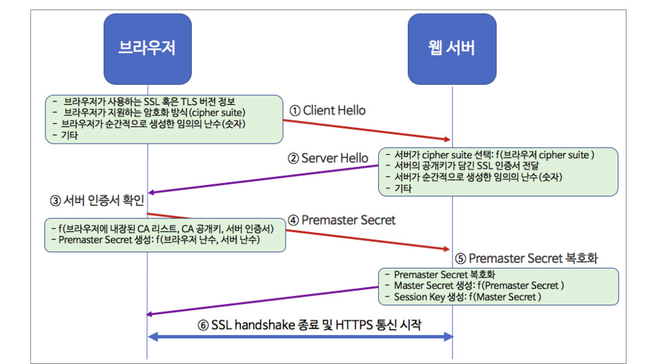 - 암호화 : 서버는 브라우저와 공개 키를 공유하고, 이어서 브라우저는 이 키를 사용해 프리마스터 키(pre-master key)를 생성, 암호화합니다. 이를 키 교환이라 합니다.