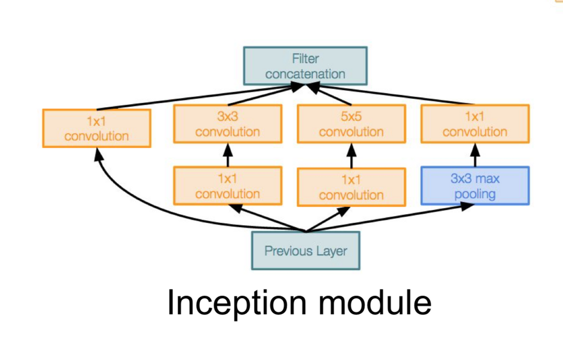 - GoogLeNet(=Inception V3) (2015) : 하나의 계층에서도 다양한 종류의 필터, 풀링을 도입 → 계층를 두텁게 확장